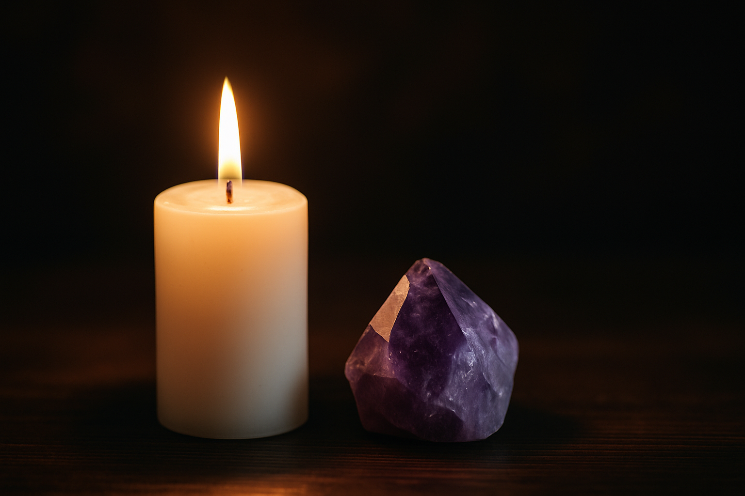 Una mesa con una vela, una tela oscura, una piedra (amatista o cuarzo) y un vaso de agua es suficiente.